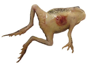 Fowlers Toads (Bufo fowleri) commonly seek out river and lakeshores to mate during early to mid-summer, but will also visit seasonal waters such as storm ponds and vernal pools. The toad pictured here was discovered this Spring near an Appomattox County swimming pool. The missing, front right leg is a birth defect. Such malformations can occur naturally and have received considerable press attention in recent years. The abrasion on the chest resulted from this toad having to half-hop, half-drag itself in getting about, and eventually led to its demise.