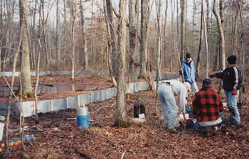 Crew installing a drift fence around a pool to study pond-breeding amphibians